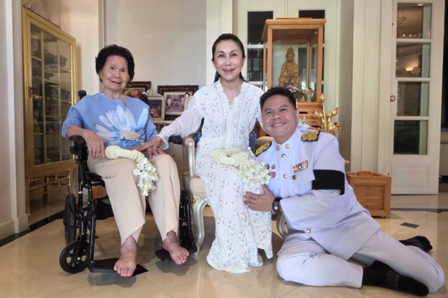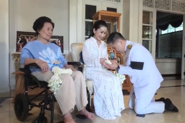 โดยนายวราวุธ นำพวงมาลัยกราบคุณหญิงแจ่มใส พร้อมกล่าวว่า "ลูกชายมาขอพรแม่ครับ" ซึ่งคุณหญิงแจ่มใส ได้กล่าวอวยพรว่า "คิดอะไรขอให้ได้ทุกสิ่งทุกอย่างที่ต้องการ"