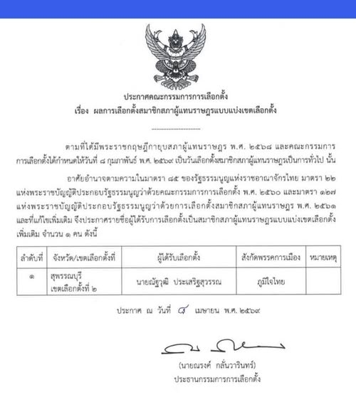 วันที่ 8 เม.ย. นายณรงค์ กลั่นวารินทร์ ประธาน กกต.ได้ลงนามประกาศ กกต. เรื่องผลเลือกตั้งสมาชิกสภาผู้แทนราษฎรแบบเขตเลือกตั้ง โดยได้ประกาศรายชื่อผู้ได้รับเลือกตั้งเป็น สส. เพิ่มเติม 1 คน คือ นายณัฐวุฒิ ประเสริฐสุวรรณ สส. สุพรรณบุรี เขต 2 พรรคภูมิใจไทยโดยการประกาศในครั้งนี้จะมี สส.เขต และ บัญชีรายชื่อ ครบจำนวน 500 คนแล้ว
