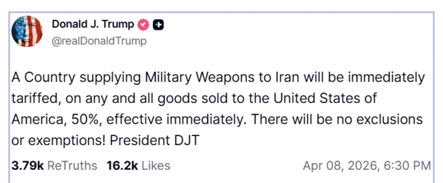 ประธานาธิบดี โดนัลด์ เจ. ทรัมป์ สร้างความสั่นสะเทือนให้กับการค้าโลกอีกครั้ง หลังประกาศนโยบายล่าสุดผ่านโซเชียลมีเดีย โดย ระบุว่า"ประเทศใดก็ตามที่จัดหาอาวุธยุทโธปกรณ์ให้กับอิหร่าน จะถูกเรียกเก็บภาษีศุลกากรทันที 50% สำหรับสินค้าทุกประเภทที่ส่งมาขายยังสหรัฐอเมริกา โดยมีผลบังคับใช้ในทันที ทั้งนี้จะไม่มีข้อยกเว้นหรือการผ่อนปรนใดๆ ทั้งสิ้น!