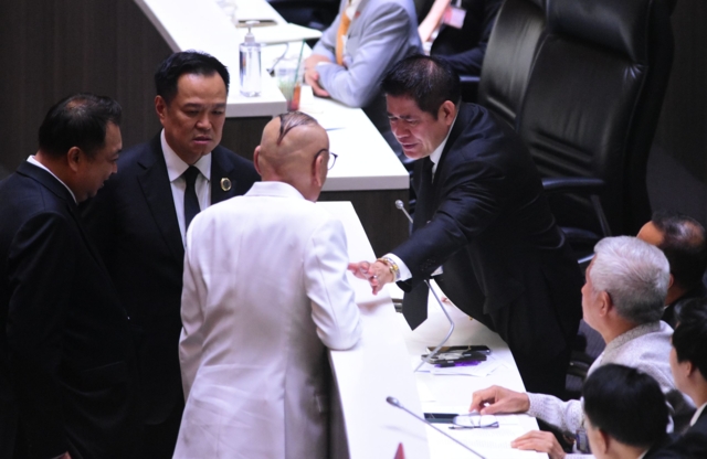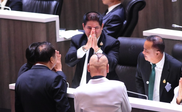 โดยช่วงหนึ่งนายอนุทิน เดินไปที่บริเวณนั่งของ สส. พรรคกล้าธรรม พร้อมกับนายชาดา ไทยเศรษฐ์ สส.อุทัยธานี พรรคภูมิใจไทย และนายสุชาติ ชมกลิ่น รัฐมนตรีว่าการกระทรวงทรัพยากรธรรมชาติและสิ่งแวดล้อม ในฐานะสส.ชลบุรี พรรคภูมิใจไทย โดยนายอนุทิน ได้ยกมือไหว้ ร.อ.ธรรมนัส พรหมเผ่า สส.บัญชีรายชื่อ พรรคกล้าธรรม ก่อนที่ร.อ.ธรรมนัส จะรับไหว้ พร้อมกับที่นายอนุทิน จะยื่นมือไปแตะที่แขนของร.อ.ธรรมนัส แล้วจะพูดคุยอย่างเป็นกันเอง ด้วยสีหน้ายิ้มแย้มกันทั้ง 2 ฝ่าย