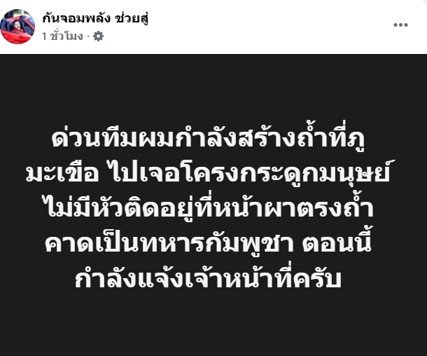 เมื่อวันที่ 9 เมษายน 2569 ผู้สื่อข่าวรายงานว่า "กัน จอมพลัง" หรือ คุณกัณฐัศว์ พงศ์ไพบูลย์เวชย์ ได้โพสต์ข้อความผ่านเฟซบุ๊กส่วนตัว แจ้งเหตุการณ์ระทึกหลังทีมงานรุดลงพื้นที่บริเวณภูมะเขือ เพื่อดำเนินการสร้างถ้ำ แต่กลับพบโครงกระดูกมนุษย์ในสภาพไม่สมบูรณ์