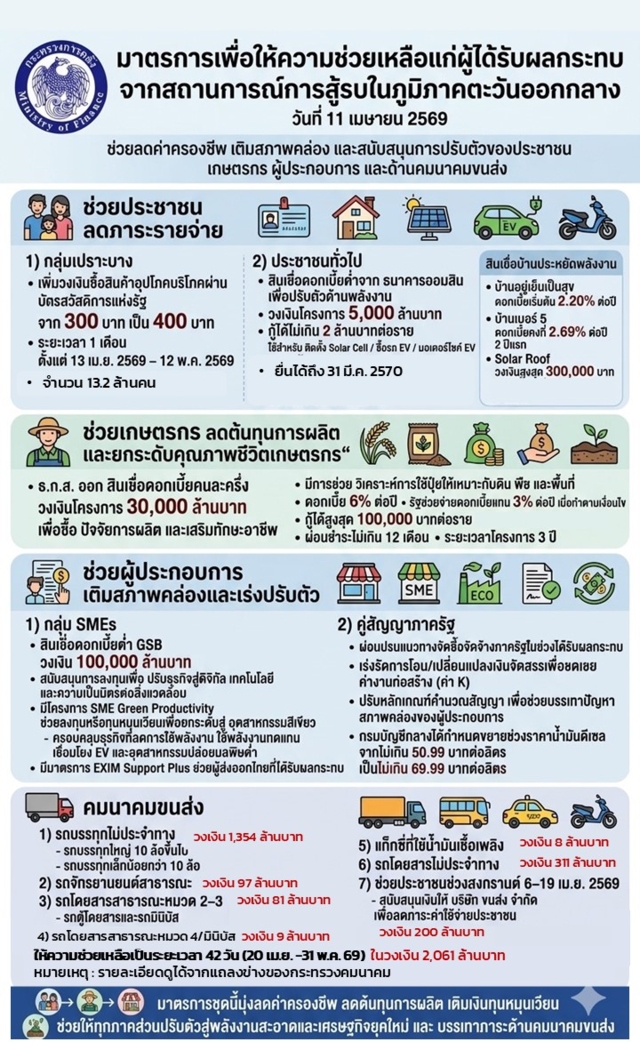 นายเอกนิติ นิติทัณฑ์ประภาศ รองนายกรัฐมนตรีและรัฐมนตรีว่าการกระทรวงการคลัง ประกาศมาตรการให้ความช่วยเหลือผู้ได้รับผลกระทบจากชนะการการสู้รบในภูมิภาคตะวันออกกลาง