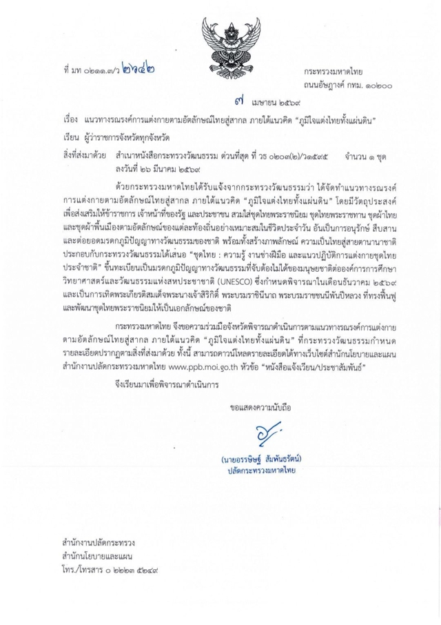 “ขอเชิญชวนเพื่อนข้าราชการ พนักงาน เจ้าหน้าที่ ในสังกัดกระทรวงมหาดไทย ตลอดจนพี่น้องข้าราชการองค์กรปกครองส่วนท้องถิ่น และข้าราชการสังกัดต่าง ๆ ในทุกพื้นที่ ได้ร่วมเป็นส่วนหนึ่งในการอนุรักษ์ สืบสาน และต่อยอดมรดกภูมิปัญญาทางวัฒนธรรมของชาติ เสริมสร้างภาพลักษณ์ความเป็นไทยสู่สายตานานาชาติ และเป็นส่วนหนึ่งของการสนับสนุนการขึ้นทะเบียน "ชุดไทย : ความรู้ งานช่างฝีมือ และแนวปฏิบัติการแต่งกายชุดไทยประจำชาติ" เป็นมรดกภูมิปัญญาทางวัฒนธรรมที่จับต้องไม่ได้ของมนุษยชาติต่อองค์การการศึกษาวิทยาศาสตร์และวัฒนธรรมแห่งสหประชาชาติ (UNESCO) ซึ่งกำหนดพิจารณาในเดือนธันวาคม 2569 นี้ และเป็นการเทิดพระเกียรติสมเด็จพระนางเจ้าสิริกิติ์ พระบรมราชินีนาถ พระบรมราชชนนีพันปีหลวง ผู้ทรงฟื้นฟู อนุรักษ์ และพัฒนาชุดไทยพระราชนิยมให้เป็นเอกลักษณ์ของชาติ ด้วยการร่วมแต่งกายด้วย “ชุดไทยพระราชนิยม ชุดไทยพระราชทาน ชุดไทยร่วมสมัย ชุดไทยประยุกต์ ผ้าไทย และชุดผ้าพื้นเมืองของจังหวัด ตามความสนใจและเหมาะสม” ด้วยความภาคภูมิใจในความเป็นไทยไปพร้อมกัน”