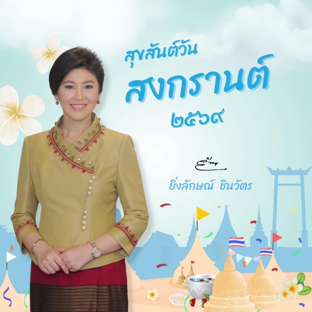 วันที่ 13 เม.ย. น.ส. ยิ่งลักษณ์ ชินวัตร อดีตนายกรัฐมนตรี โพสต์ข้อความอวยพรเนื่องในวันสงกรานต์ ว่า สวัสดีปีใหม่ไทย 2569 สงกรานต์ปีนี้ ขอสิ่งศักดิ์สิทธิ์ในสากลโลก ดลบันดาลให้พี่น้องประชาชนคนไทย มีความสุข ความเจริญ สดชื่น สมหวังดังตั้งใจในทุกสิ่ง มีสุขภาพกายสุขภาพใจที่แข็งแรง ปลอดภัยในทุกการเดินทาง ก้าวผ่านอุปสรรคในสภาวะเศรษฐกิจปัจจุบัน ร่ำรวยมีเงินทองใช้ไม่ขาดมือ ตลอดปี และตลอดไป
