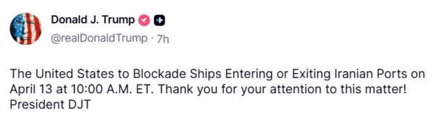 ประธานาธิบดีโดนัลด์ ทรัมป์ ของสหรัฐฯ ได้ออกมาโพสต์ข้อความผ่านทางทรูธ โซเชียล "@RealDonaldTrump" โดยระบุข้อความ ว่าสหรัฐอเมริกามีแผนจะดำเนินการปิดล้อมเรือทุกลำที่เดินทางเข้าหรือออกจากท่าเรือของประเทศอิหร่าน โดยมาตรการดังกล่าวจะเริ่มต้นอย่างเป็นทางการในวันที่ 13 เมษายน เวลา 10:00 น. ตามเวลามาตรฐานตะวันออก (ET) เพื่อเป็นการยกระดับมาตรการกดดันต่ออิหร่านในเชิงภูมิรัฐศาสตร์