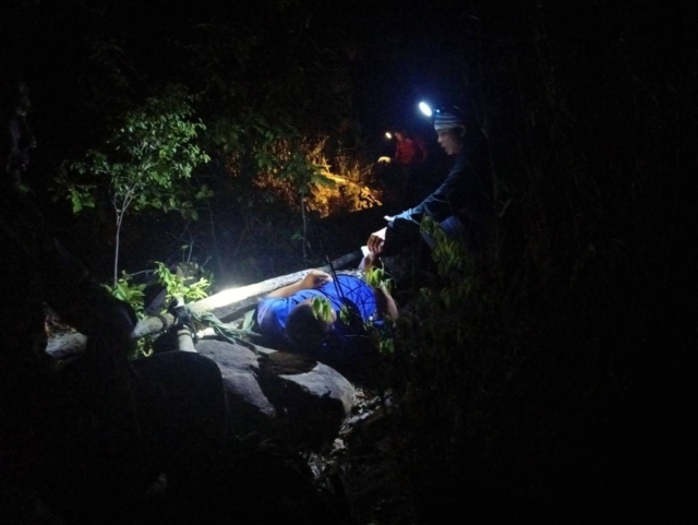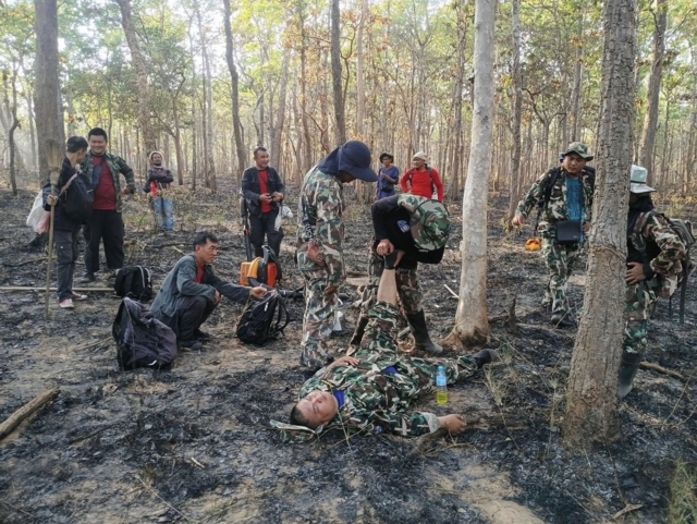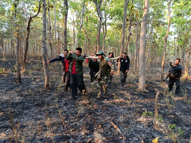 หลังเสร็จสิ้นภารกิจ ระหว่างเดินทางกลับ พบว่ามีเจ้าหน้าที่ 2 นาย มีอาการบาดเจ็บจากการทำงานหนัก คือ นายรัตนกร บับพาน มีอาการตะคริวรุนแรงจนไม่สามารถเดินเท้าออกจากพื้นที่ได้ และนายอนุชา โคตรสขึง มีอาการวูบ หน้ามืด และอ่อนแรงอย่างกะทันหัน เพื่อความปลอดภัย ทีมเจ้าหน้าที่ที่เหลือได้ร่วมกันปฐมพยาบาลเบื้องต้นและใช้เปลสนามเคลื่อนย้ายผู้ป่วยลงจากภูเขาอย่างทุลักทุเล จนถึงพื้นล่างเวลา 20.20 น. ก่อนนำตัวส่งโรงพยาบาลมุกดาหารทันที ล่าสุดเจ้าหน้าที่ทั้ง 2 นายอยู่ในความดูแลของแพทย์แล้ว และทั้งคู่ยังมีสติดีแต่มีภาวะอ่อนแรงจากความเหนื่อยล้าสะสม