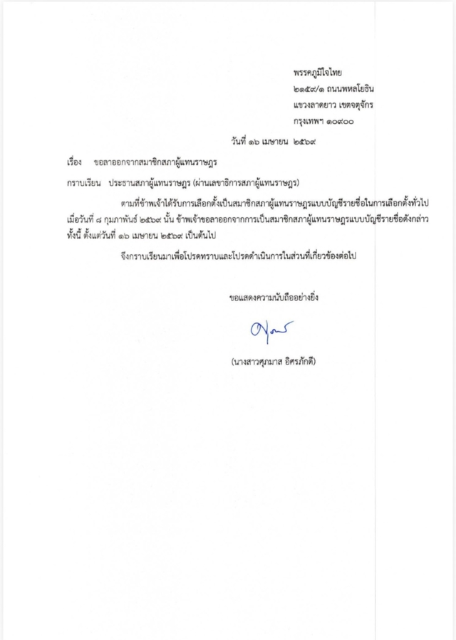 วันที่ 16 เม.ย. น.ส.ศุภมาส อิศรภักดี สส.บัญชีรายชื่อ พรรคภูมิใจไทย ได้ยื่นหนังสือถึงประธานสภาผู้แทนราษฎร ผ่านเลขาธิการสภาผู้แทนราษฎ เนื่องจากตนได้รับการเลือกตั้งเป็น สส.บัญชีรายชื่อ ในการเลือกตั้งทั่วไป เมื่อวันที่ 8 ก.พ.69 นั้น ตนขอลาออกจาก สส.บัญชีรายชื่อ ตั้งแต่วันที่ 16 เม.ย.69 เป็นต้นไป