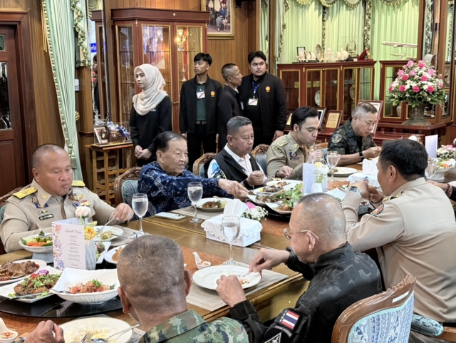 จากนั้น นายกรัฐมนตรี และคณะ ได้ร่วมโต๊ะรับทานอาหารกลางวัน โดยมี วันมูหะมัดนอร์, พล.อ.เกรียงไกร ศรีรักษ์ รองประธานวุฒิสภา อดีตแม่ทัพภาคที่ 4, นายพิพัฒน์ รัชกิจประการ รองนายกรัฐมนตรีและรัฐมนตรีว่าการกระทรวงคมนาคม, พล.ท.อดุลย์ บุญเจริญ รัฐมนตรีว่าการกระทรวงกลาโหม, พล.ต.ท.รุทธพล เนาวรัตน์ รัฐมนตรีว่าการกระทรวงยุติธรรม, นายประเสริฐ จันทรรวงทอง รัฐมนตรีว่าการกระทรวงศึกษาธิการ, นายภราดร ปริศนานันทกุล รัฐมนตรีประจำสำนักนายกรัฐมนตรี, นายเจเศรษฐ์ ไทยเศรษฐ์, นายวรศิษฐ์ เลียงประสิทธิ์ รัฐมนตรีช่วยว่าการกระทรวงมหาดไทย, นายสรรเพชร บุญญามณี รัฐมนตรีช่วยว่าการกระทรวงคมนาคม พล.อ.ชัยพฤกษ์ ด้วงประพัฒน์ เสนาธิการทหารบก พล.อ.อุกฤษณ์ บุญตานนท์ ผู้บัญชาการทหารสูงสุด, พล.ร.อ.ไพรโรจน์ เฟื่องจันทร์ ผู้บัญชาการทหารเรือ และ พล.ต.อ.สำราญ นวลมา รองผู้บัญชาการตำรวจแห่งชาติ โดยบรรยากาศเป็นไปอย่างชื่นมื่น