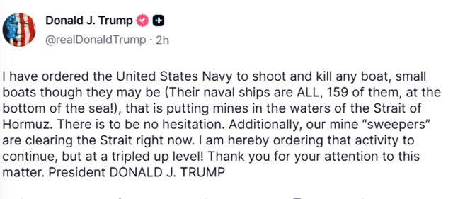 23 เม.ย. 2569 โดนัลด์ ทรัมป์ ประธานาธิบดีสหรัฐฯ เปิดเผยว่า ว่า เขาได้สั่งการให้กองทัพเรือสหรัฐฯ "ยิงและทำลาย" (Shoot and Kill) เรือทุกลำ ไม่ว่าจะเป็นเรือขนาดเล็กเพียงใดก็ตาม หากพบว่ามีการวางทุ่นระเบิดในน่านน้ำช่องแคบฮอร์มุซ พร้อมย้ำว่าปฏิบัติการครั้งนี้ต้องเป็นไปอย่างเด็ดขาดและ "ไม่ต้องลังเล" นอกจากนี้ยังอ้างว่าเรือรบขนาดใหญ่ของฝ่ายตรงข้ามเกือบทั้งหมดได้ถูกทำลายไปก่อนหน้านี้แล้ว