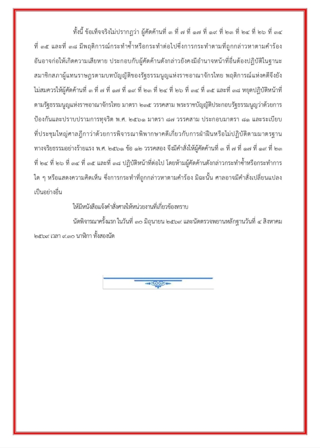 ทั้งนี้ ข้อเท็จจริงไม่ปรากฏว่า ผู้ถูกกล่าวหาที่ ปัจจุบันยังดำรงตำแหน่ง สส. มีพฤติการณ์กระทำซ้ำหรือกระทำต่อไปซึ่งการกระทำตามที่ถูกกล่าวหาตามคำร้องอันอาจก่อให้เกิดความเสียหาย ประกอบกับยังคงมีอำนาจหน้าที่อื่นที่ต้องปฏิบัติในฐานะ สส. ตามบทบัญญัติของรัฐธรรมนูญแห่งราชอาณาจักรไทย พฤติการณ์แห่งคดีจึงยังไม่สมควรให้หยุดปฏิบัติหน้าที่ ตามรัฐธรรมนูญแห่งราชอาณาจักรไทยมาตรา 235 วรรคสาม พระราชบัญญัติประกอบรัฐธรรมนูญว่าด้วยการป้องกันและปราบปรามการทุจริต พ.ศ. 2561 มาตรา 87 วรรคสาม ประกอบมาตรา 81 และระเบียบที่ประชุมใหญ่ศาลฎีกาว่าด้วยการพิจารณาพิพากษาเกี่ยวกับการฝ่าฝืนหรือไม่ปฏิบัติตามมาตรฐานทางจริยธรรมอย่างร้ายแรง พ.ศ. 2561 ข้อ 12 วรรคสองจึงมีคำสั่งให้ปฏิบัติหน้าที่ต่อไป โดยห้ามกระทำซ้ำหรือกระทำการใดใดหรือแสดงความคิดเห็นซึ่งการกระทำที่ถูกกล่าวหาตามคำร้องมิฉะนั้นศาลอาจมีคำสั่งเปลี่ยนแปลงเป็นอย่างอื่น