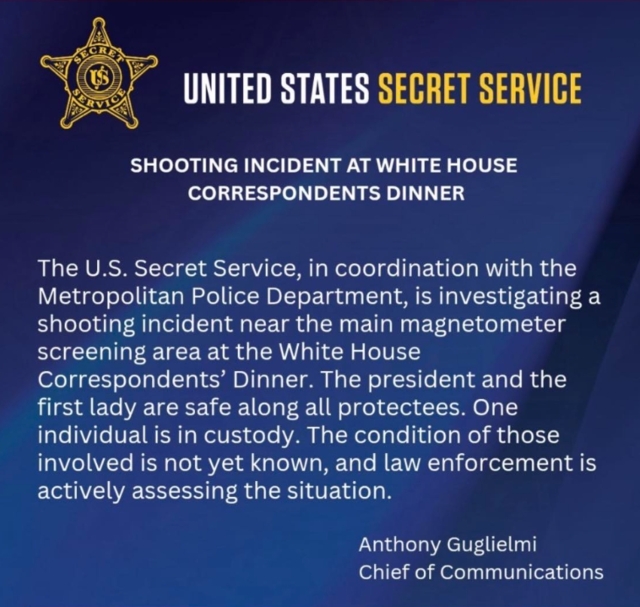 หน่วยสืบราชการลับแห่งสหรัฐอเมริกา (United States Secret Service) ออกแถลงการณ์ด่วนกรณีเกิดเหตุยิงกันบริเวณใกล้กับจุดตรวจความปลอดภัยหลัก ในงานเลี้ยงอาหารค่ำผู้สื่อข่าวทำเนียบขาว (White House Correspondents' Dinner) ยืนยันประธานาธิบดีปลอดภัยดี