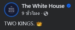 ขณะที่เฟซบุ๊กเพจ “The White House” ของทำเนียบขาว โพสต์ภาพคู่ระหว่าง สมเด็จพระเจ้าชาร์ลส์ที่ 3 และ ประธานาธิบดี โดนัลด์ ทรัมป์ พร้อมข้อความระบุว่า “TWO KINGS. 👑”