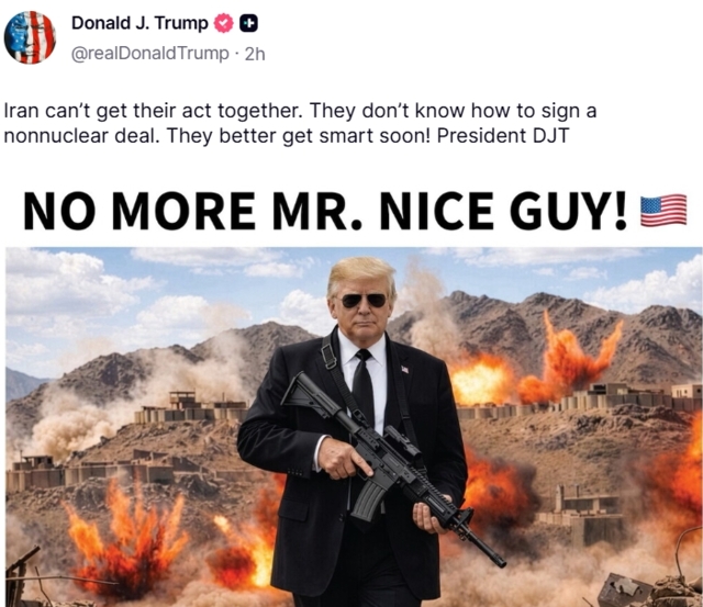 ประธานาธิบดีทรัมป์ ได้ระบุในข้อความว่า "อิหร่านจัดการตัวเองไม่ได้เลย พวกเขาไม่รู้ด้วยซ้ำว่าจะเซ็นข้อตกลงไม่พัฒนาอาวุธนิวเคลียร์ยังไง พวกเขาควรจะฉลาดขึ้นให้เร็วกว่านี้หน่อยนะ!"สิ่งที่ทำให้โพสต์นี้กลายเป็นไวรัลคือภาพที่แนบมาด้วย ซึ่งเป็นภาพประธานาธิบดีทรัมป์ในชุดสูทสีดำ สวมแว่นกันแดด และถืออาวุธปืนยาว ยืนอยู่หน้าฉากหลังที่เป็นระเบิดและซากปรักหักพัง พร้อมตัวอักษรขนาดใหญ่ระบุว่า "NO MORE MR. NICE GUY!" (จะไม่ยอมเป็นคนใจดีอีกต่อไปแล้ว!)