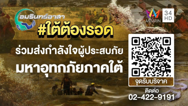 อมรินทร์อาสา โดยอมรินทร์ทีวี เอชดี ช่อง 34 ขอร่วมส่งกำลังใจและความห่วงใยให้ผู้ประสบมหาอุทกภัยภาคใต้ #ใต้ต้องรอด ด้วยการเปิดรับบริจาคสิ่งของจำเป็น สำหรับส่งไปช่วยเหลือพี่น้องประชาชนที่กำลังเผชิญวิกฤตน้ำท่วม