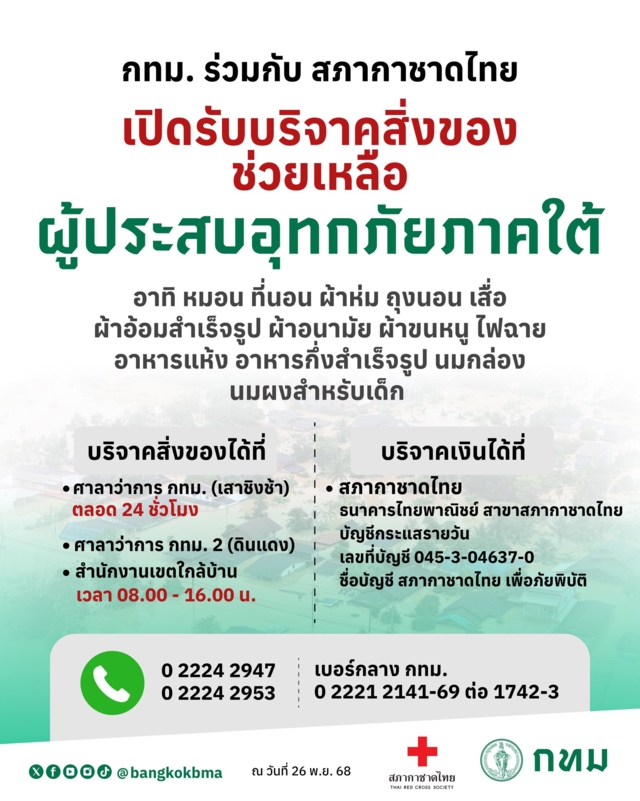เปิดรับบริจาคสิ่งของจำเป็นเพื่อช่วยเหลือผู้ประสบอุทกภัยภาคใต้ โดยตั้งจุดรับบริจาค 52 จุด ทั่วกรุงเทพฯ