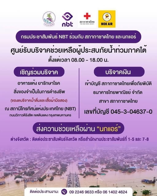 - เปิด "ศูนย์ประชาสัมพันธ์และศูนย์รับบริจาคเพื่อช่วยเหลือผู้ประสบภัยน้ำท่วมภาคใต้" จุดรับบริจาค สถานีโทรทัศน์แห่งประเทศไทย NBT ถนนวิภาวดีรังสิต
