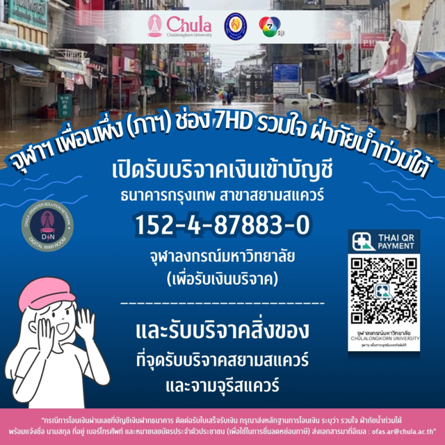 - ผู้ประสงค์ร่วมบริจาคเงินสามารถโอนเข้าบัญชี ธนาคารกรุงเทพ สาขาสยามสแควร์ เลขที่ 152-4-87883-0 ชื่อบัญชี: จุฬาลงกรณ์มหาวิทยาลัย (เพื่อรับเงินบริจาค)