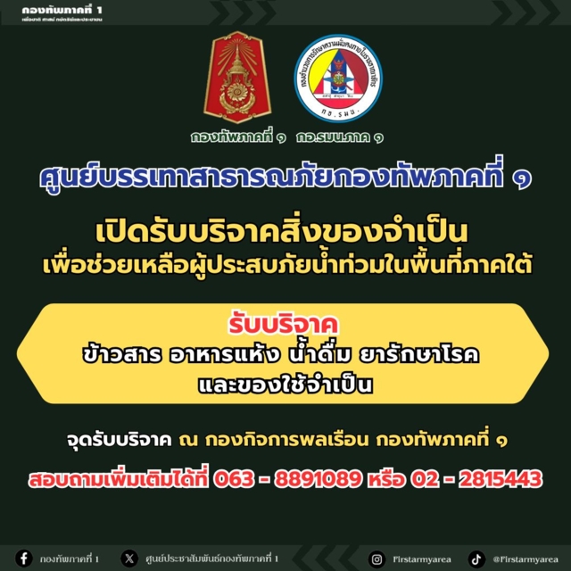 - จุดรับบริจาค ณ กองกิจการพลเรือนกองทัพภาคที่ 1