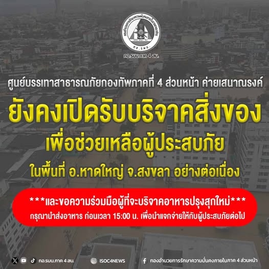 ส่วนหน้า ค่ายเสนาณรงค์ ยังคงเปิดรับบริจาคสิ่งของเพื่อช่วยเหลือผู้ประสบภัยในพื้นที่ อ.หาดใหญ่ จ.สงขลา อย่างต่อเนื่อง และขอความร่วมมือผู้ที่จะบริจาคอาหารปรุงสุกใหม่
