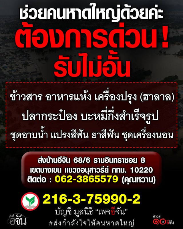 - สามารถนำ ข้าวสาร อาหารแห้ง เครื่องปรุง ผ้าห่ม ผ้าขนหนู เครื่องอาบน้ำ ขนมให้เด็กๆ มาสมทบได้ที่บ้านอีจัน 68/6 รามอินทราซอย 8 แขวงอนุสาวรีย์ เขตบางเขน กรุงเทพ 10220