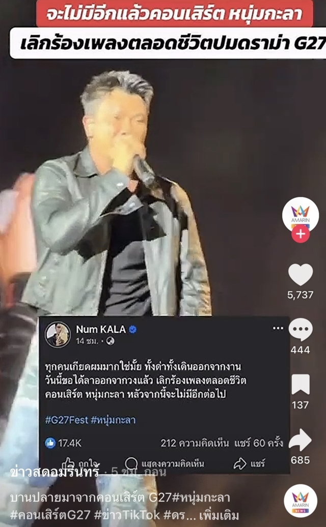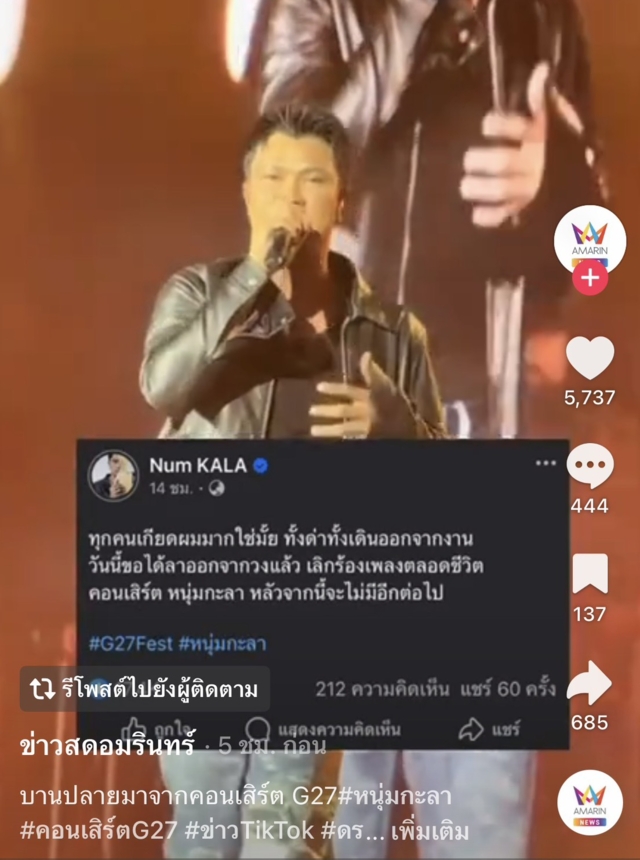 ล่าสุดมีช่องปลอมใช้ชื่อ gg_55.4 ข่าวสดอมรินทร์ ลงข่าวระบุ จะไม่มีอีกแล้วคอนเสิร์ต หนุ่มกะลา เลิกร้องเพลงตลอดชีวิตปมดรามา G27 พร้อมรูปจากโพสต์ Num KALA ที่ระบุข้อความว่า “ทุกคนเกลียดผมมากใช่มั้ย ทั้งด่าทั้งเดินออกจากงาน วันนี้ขอได้ลาออกจากวงแล้ว เลิกร้องเพลงตลอดชีวิต คอนเสิร์ต หนุ่มกะลา หลังจากนี้จะไม่มีอีกแล้ว”