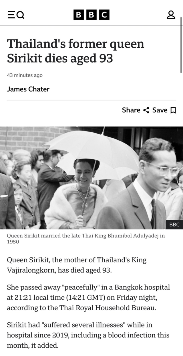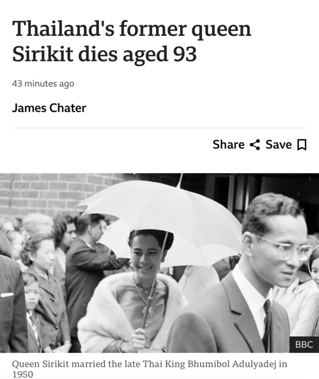 สำนักข่าวบีบีซี ของสหราชอาณาจักรรายงานข่าว สำนักพระราชวังออกแถลงการณ์ว่า สมเด็จพระนางเจ้าสิริกิติ์ พระบรมราชินีนาถ พระบรมราชชนนีพันปีหลวง เสด็จสวรรคตอย่างสงบ ณ โรงพยาบาลในกรุงเทพมหานคร เมื่อเวลา 21.21 น. ของคืนวันศุกร์ที่ 24 ตุลาคม 2568