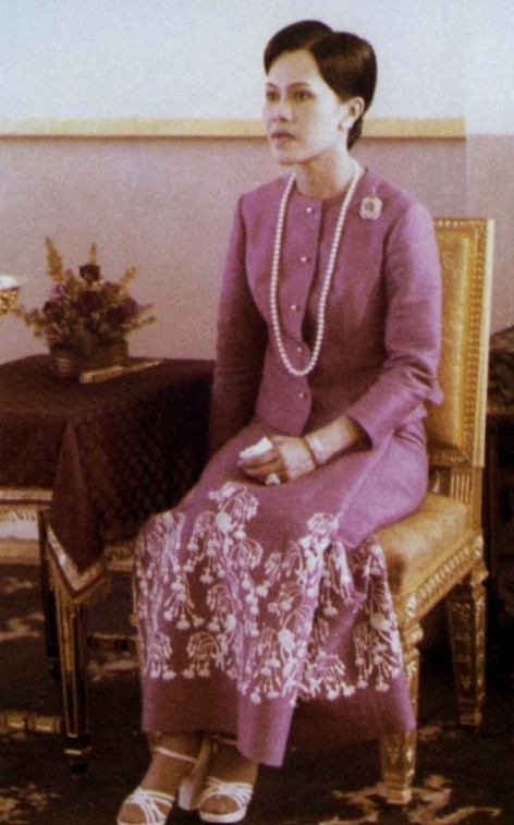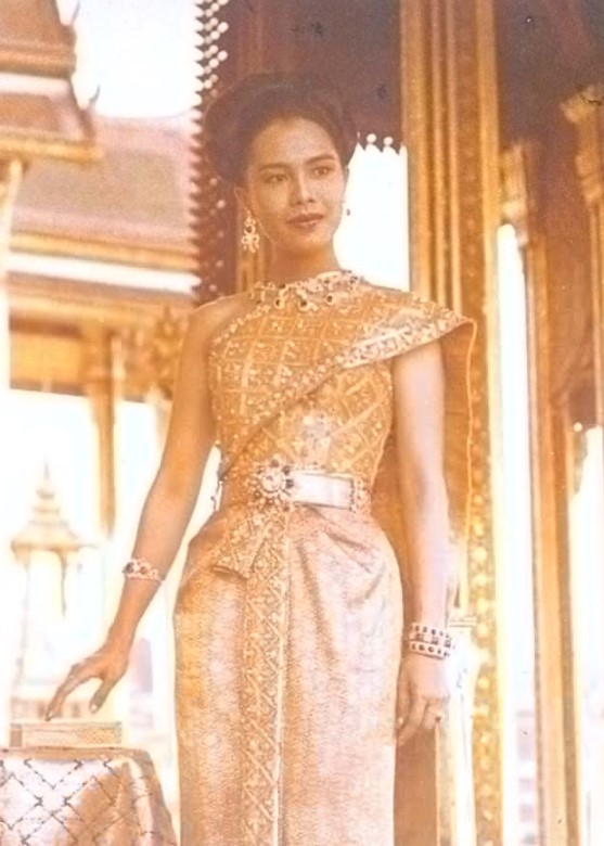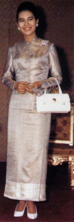 ชุดไทยอมรินทร์ ใช้เป็นชุดพิธีตอนค่ำ ผ้าซิ่นยกทองทั้งตัว เสื้อแขนยาว คอตั้ง เช่นเดียวกับไทยจิตรลดา
