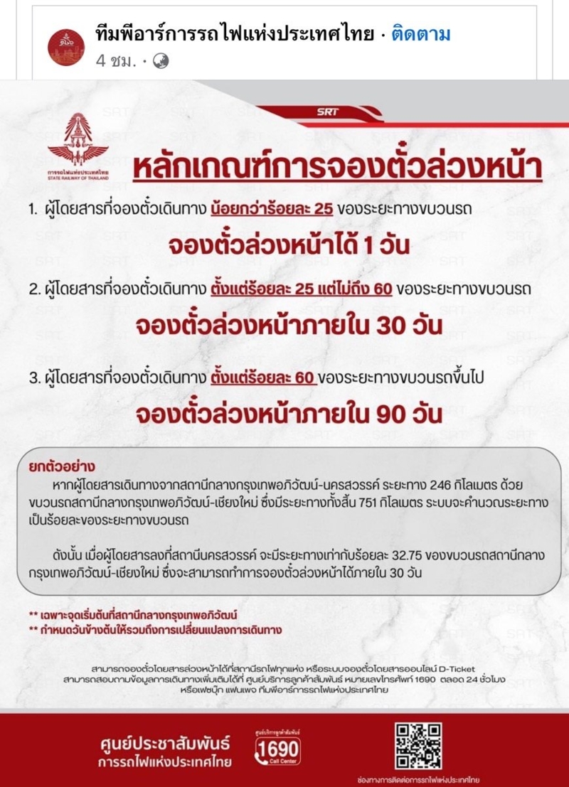 กำลังเป็นประเด็นดรามาและถูกวิพากษ์วิจารณ์ในโลกออนไลน์ เมื่อเพจเฟซบุ๊กของ "ทีมพีอาร์การรถไฟแห่งประเทศไทย" เผยแพร่ข่าวประชาสัมพันธ์ พร้อมอินโฟกราฟฟิกภาพอธิบายข้อมูลต่าง ๆ เรื่องระเบียบการจองตั๋วรถไฟล่วงหน้า