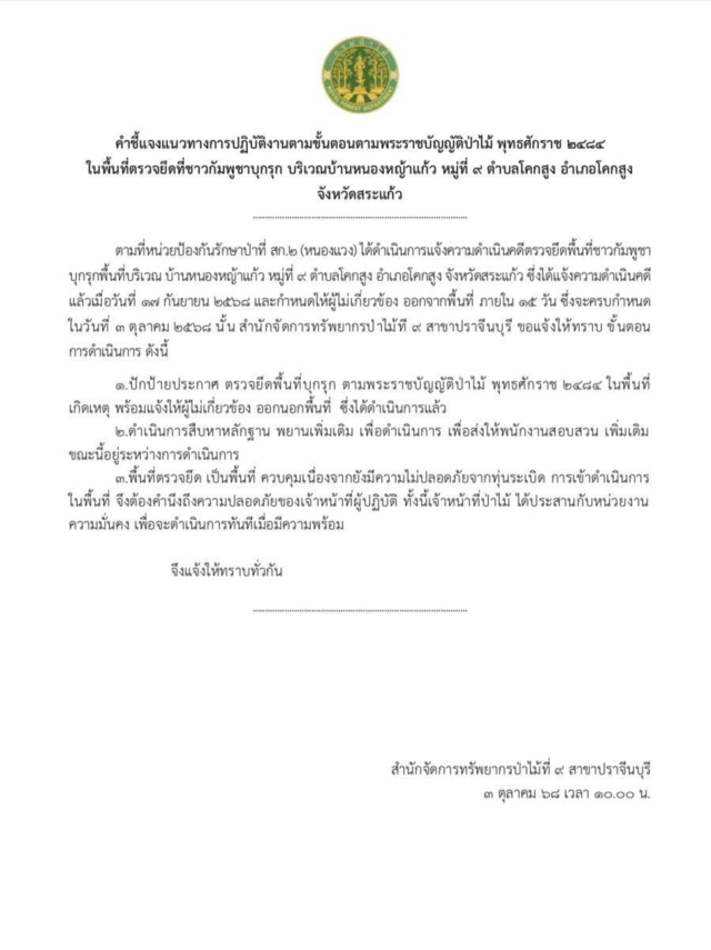 วันที่ 3 ต.ค. 68 สำนักจัดการทรัพยากรป่าไม้ที่ 9 สาขาปราจีนบุรี ออกคำชี้แจงแนวทางการปฏิบัติงานตามขั้นตอนตามพระราชบัญญัติป่าไม้ พุทธศักราช 2484 ในพื้นที่ตรวจยึดที่ชาวกัมพูชาบุกรุก บริเวณบ้านหนองหญ้าแก้ว หมู่ที่ 9 ตำบลโคกสูง อำเภอโคกสูง จังหวัดสระแก้ว