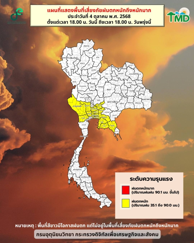 จากอิทธิพลของพายุ "แมตโม" ส่งผลให้ในช่วงวันที่ 5-7 ต.ค. 2568 มรสุมตะวันตกเฉียงใต้ที่พัดปกคลุมทะเลอันดามัน ประเทศไทย และอ่าวไทยจะมีกำลังแรงขึ้น ทำให้ภาคเหนือ และภาคตะวันออกเฉียงเหนือมีฝนเพิ่มขึ้น และมีฝนตกหนักบางแห่ง รวมทั้งด้านรับมรสุมของภาคตะวันออก และภาคใต้ฝั่งตะวันตก ขอให้ประชาชนในบริเวณดังกล่าวระวังอันตรายจากฝนตกหนัก และฝนที่ตกสะสม ซึ่งอาจทำให้เกิดน้ำท่วมฉับพลัน น้ำป่าไหลหลาก และน้ำล้นตลิ่ง โดยเฉพาะพื้นที่ลาดเชิงเขาใกล้ทางน้ำไหลผ่าน พื้นที่ลุ่ม และพื้นที่น้ำท่วมขัง