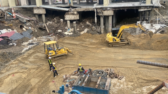 อย่างไรก็ตาม นายวัชรพล ยอมรับว่า ตัวอาคารยังมีการทรุดตัวอยู่ประมาณ 20 - 50 เซนติเมตร ในลักษณะฝั่งซ้ายและขวาเอนเข้าหากัน ซึ่งเจ้าหน้าที่กําลังเร่งถมทรายลงด้านล่างเพื่อรองรับนํ้าหนัก