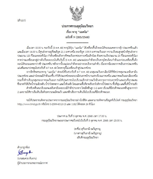 ประกาศกรมอุตุนิยมวิทยาเรื่อง พายุ “แมตโม” ฉบับที่ 9 (285/2568)
