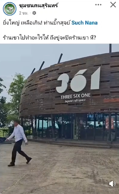 ยิ่งใหญ่เหลือเกินท่าน บิ๊กสุจ SuchNana ร้านเขาไปทำอะไรให้ถึงขู่จะปิดร้านเขาหึ โดยในคลิปเป็นร้านกาแฟที่ชื่อ “361THREESIXONEBeyondcaféspace” ซึ่งเป็นร้านของคนไทยที่ไปลงทุนเปิดร้านอยู่ที่ประเทศกัมพูชาหลายสาขา โดยหลวงตาสุจได้พูดในคลิปว่า "361THREESIXONE เป็นร้านอาหารของคนไทยที่มาเปิดในกัมพูชาผมก็ให้เกียรติ ผมไม่เคยกลั่นแกล้ง แต่ถ้าคนไทยยังด่าผมทุกวันๆอยู่อย่างนี้ 361THREESIXONE อยู่ไม่ได้หรอกครับ หลายสาขาในกัมพูชาปิดตัวลงแน่นอน ร้าน 361THREESIXONE เป็นของคนสุรินทร์ ผมให้เกียรติคนสุรินทร์ ผมให้เกียรติคนไทยเอาผมทุกวันๆนี่น่ะร้านนี้และอีกสาขาในกัมพูชาเตรียมปิดตัวได้เลยครับ361THREESIXONE"