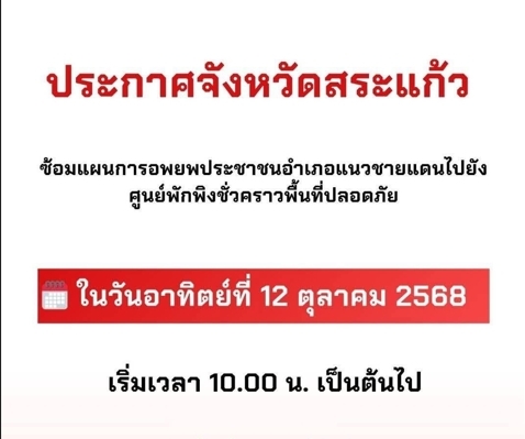 วันที่ 11 ต.ค. 68 ผู้ส่อข่าวรายงานว่า ทางจังหวัดสระแก้ว ได้ออกประกาศซ้อมแผนอพยพประชาชนชายแดนไปยังศูนย์พักพิงชั่วคราว เตรียมความพร้อมรับสถานการณ์ฉุกเฉิน ในวันอาทิตย์ที่ 12 ตุลาคม 2568 เริ่มเวลา 10.00 น. เป็นต้นไป