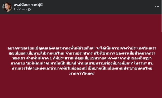 ล่าสุดทางด้าน บุ๋ม ปนัดดา ได้โพสต์ถึงกรณีดังกล่าว ระบุว่า อยากจะขอเรียนเชิญคุณอังคณามาลงพื้นที่ด้วยกันค่ะ จะได้เห็นความจริงว่าประเทศไทยเราสูญเสียและเสียหายไปมากแค่ไหน จำนวนประชากร ที่ไม่ใช่ทหาร ของเราเสียชีวิตมากกว่าของเขา ส่วนพื้นที่ภาค 1 ก็มีประชาชนที่สูญเสียแขนขาและดวงตาจากทุ่นของกัมพูชามากมาย ไม่มีที่ดินทำกินมานับเป็นสิบๆปี ท่านเคยรับทราบเรื่องนี้บ้างมั้ยคะ? ในฐานะ สว. ท่านควรใช้ตำแหน่งและอำนาจที่มีในมือตอนนี้ เป็นปากเป็นเสียงแทนประชาชนคนไทยมากกว่าไหมคะ