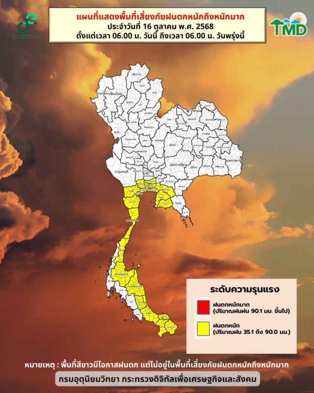 มีฝนฟ้าคะนอง ร้อยละ 70 ของพื้นที่ และมีฝนตกหนักบางแห่ง บริเวณจังหวัดเพชรบุรี ประจวบคีรีขันธ์ ชุมพร สุราษฎร์ธานี นครศรีธรรมราช พัทลุง