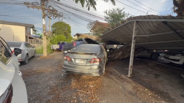 นางรัชนี บุญเอื้อ อายุ 43 ปี แม่ค้าขายน้ำบริเวณใกล้เคียงเล่าว่า ขณะเกิดเหตุมีฝนตกลงมาและลมแรงได้ยินเสียงสังกะสีของโรงจอดรถหมุนดังสนั่น ก่อนเห็นต้นจามจุรีโยกแรงและล้มทับโรงจอดรถทำให้รถที่จอดอยู่ภายในได้รับความเสียหายหลายคัน ตนตกใจมากจนรีบวิ่งเข้าไปหลบในร้าน และยอมรับว่ายังรู้สึกผวาเพราะไม่เคยเจอเหตุการณ์รุนแรงเช่นนี้มาก่อน