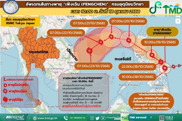 กรมอุตุนิยมวิทยา อัปเดตเส้นทางพายุโซนร้อน "เฟิงเฉิน" (Fengchen) เวลา 10.00 น. (18 ต.ค. 2568) พายุโซนร้อน "เฟิงเฉิน" ก่อตัวอยู่บริเวณ ด้านตะวันออกของประเทศฟิลิปปินส์ คาดว่าจะเคลื่อนผ่าน เกาะลูซอน แล้วลงสู่ ทะเลจีนใต้ตอนบน