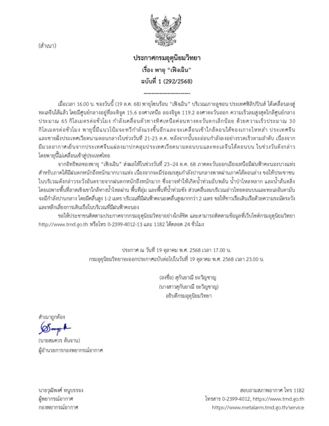 กรมอุตุฯประกาศกรมอุตุนิยมวิทยาเรื่อง พายุ "เฟิงเฉิน" ฉบับที่ 1 (292/2568)