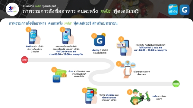 - ใช้จ่ายผ่านแอปฯ เป๋าตัง G Wallet ในโครงการคนละครึ่งพลัส กรณีใช้จ่ายซื้ออาหาร/เครื่องดื่มผ่านแพลตฟอร์มฟู้ดเดลิเวอรี ที่เข้าร่วมโครงการ จะสามารถเริ่มใช้จ่ายได้วันที่ 7 พ.ย. 2568 ระหว่างเวลา 06.00 - 21.00 น.