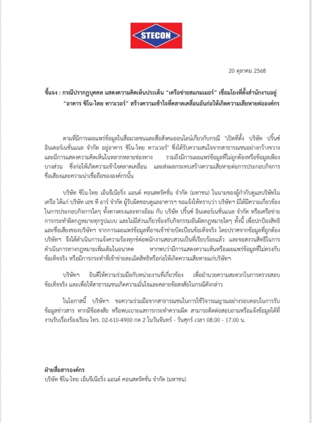 วันที่ 20 ต.ค.2568 ผู้สื่อข่าวรายงานว่า ฝ่ายสื่อสารองค์กร บริษัท ซีโน-ไทย เอ็นจีเนียริ่ง แอนด์ คอนสตรัคชั่น จำกัด (มหาชน) ออกเอกสารชี้แจงกรณีปรากฏบุคคล แสดงความคิดเห็นประเด็น "เครือข่ายสแกมเมอร์" เชื่อมโยงที่ตั้งสำนักงานอยู่ "อาคาร ชิโน-ไทย ทาวเวอร์" สร้างความเข้าใจที่คลาดเคลื่อนอันก่อให้เกิดความเสียหายต่องค์กร