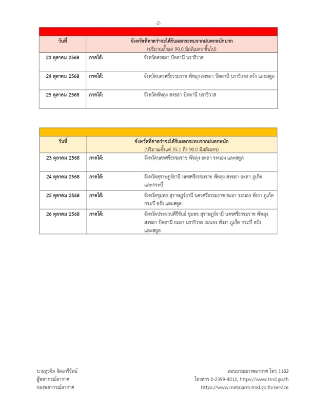 จากอิทธิพลของพายุ "เฟิงเฉิน" ส่งผลให้ในช่วงวันที่ 23-24 ต.ค. 2568 ภาคตะวันออกเฉียงเหนือมีฝนฟ้าคะนองบางแห่ง สำหรับภาคใต้มีฝนตกหนักถึงหนักมากบางแห่ง เนื่องจากมีร่องมรสุมกำลังปานกลางพาดผ่านภาคใต้ตอนกลาง ขอให้ประชาชนในบริเวณดังกล่าวระวังอันตรายจากฝนตกหนักถึงหนักมาก ซึ่งอาจทำให้เกิดน้ำท่วมฉับพลัน น้ำป่าไหลหลาก และน้ำล้นตลิ่ง โดยเฉพาะพื้นที่ลาดเชิงเขาใกล้ทางน้ำไหลผ่าน พื้นที่ลุ่ม และพื้นที่น้ำท่วมขัง ส่วนคลื่นลมบริเวณอ่าวไทยตอนบนและทะเลอันดามันจะมีกำลังปานกลาง โดยมีคลื่นสูง 1-2 เมตร บริเวณที่มีฝนฟ้าคะนองคลื่นสูงมากกว่า 2 เมตร ขอให้ชาวเรือเดินเรือด้วยความระมัดระวัง และหลีกเลี่ยงการเดินเรือในบริเวณที่มีฝนฟ้าคะนอง