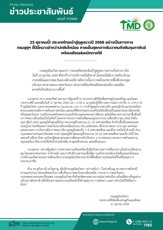 กรมอุตุนิยมวิทยา แถลงว่า ประเทศไทยจะเริ่มเข้าสู่ฤดูหนาวอย่างเป็นทางการในวันที่ 23 ตุลาคม 2568 ซึ่งล่าช้ากว่าปกติราวหนึ่งสัปดาห์ โดยจะเริ่มมีอากาศเย็นบริเวณภาคเหนือและภาคตะวันออกเฉียงเหนือ หลังจากนั้นอากาศเย็นจะขยายพื้นที่ครอบคลุมบริเวณภาคกลางและภาคตะวันออก ส่วนภาคใต้จะยังคงมีฝนตกต่อเนื่อง และมีฝนตกหนักถึงหนักมากบางพื้นที่