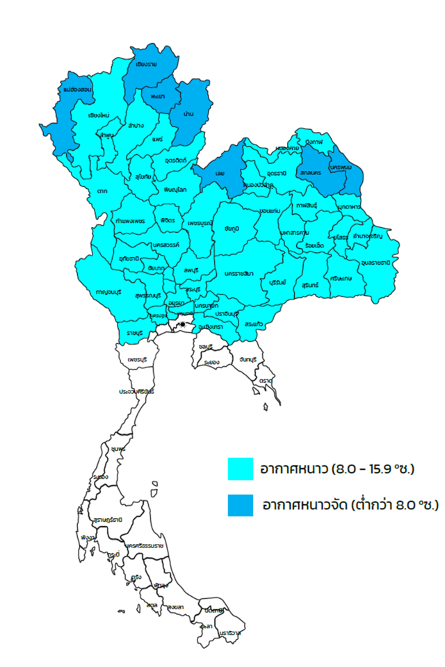 หมายเหตุ : ข้อมูลเป็นการคาดหมายระยะนาน ควรติดตามการพยากรณ์อากาศประจำวันด้วย อากาศหนาว หนาวจัด ไม่รวมยอดดอย ยอดภู และบริเวณเทือกเขา