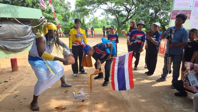 โดยในพิธีดังกล่าว นายไดม่อนได้นำหม้อดินและรองเท้าแตะคู่หนึ่ง มาประกอบพิธีตามความเชื่อพื้นบ้าน พร้อมนำภาพของ “บักบอย” มาติดไว้ที่รองเท้า ก่อนจะทำท่าทางเชิงสัญลักษณ์ “จับยัดบักบอยลงหม้อดิน” ท่ามกลางเสียงฮือฮาและความสนุกสนานของประชาชนที่มาร่วมให้กำลังใจเจ้าหน้าที่