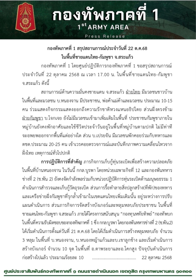 วันที่ 22 ต.ค.2568 กองทัพภาคที่ 1 โดยศูนย์ปฏิบัติการกองทัพภาคที่ 1 ขอสรุปสถานการณ์ประจำวันที่ 22 ตุลาคม 2568 ณ เวลา 17.00 น. ในพื้นที่ชายแดนไทย-กัมพูชา จ.สระแก้ว โดยสถานการณ์ด้านความมั่นคงชายแดน จ.สระแก้ว ฝ่ายไทย มีมวลชนชาวบ้านในพื้นที่และมวลชน บ.หนองจาน มีประชาชน, พ่อค้าแม่ค้าและมวลชน ประมาณ 10-15 คน ร่วมแสดงกิจกรรมแสดงออกถึงความรักชาติหวงแหนอธิปไตย