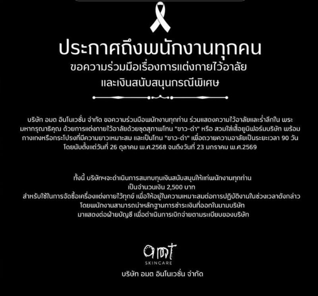 ประกาศถึงพนักงานทุกคน ขอความร่วมมือเรื่องการแต่งกายไว้อาลัย และเงินสนับสนุนกรณีพิเศษ