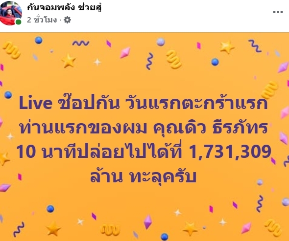 ซึ่ง "ดิว ธีรภัทร" ประกาศกลางไลฟ์ว่าได้สนับสนุน "กัน จอมพลัง" ด้วยการ บริจาคเงิน 1 แสนบาทเข้ามูลนิธิ งานนี้ทำเอาแฟนคลับของ กัน จอมพลัง ก็ไม่พลาดเข้ามาให้กำลังใจพร้อมแห่คอมเมนต์รัว ๆ ว่า กันขายเก่งมาก, เสียงดีเหมือนร้องเพลงขายของ, ไลฟ์แรกก็ปังแล้ว ขายเก่งเกินต้าน โดยบางคอมเมนต์แอบแซวว่าอยากเห็น “บอสณวัฒน์” มาไลฟ์คู่กันในอนาคต ขณะที่อีกกว่า 40 แบรนด์ ต่อคิวรอร่วมไลฟ์กับ กัน จอมพลัง