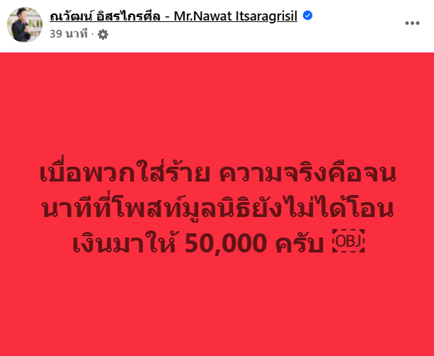 ล่าสุด วันนี้ (29 ต.ค. 2568) บอสณวัฒน์ ได้โพสต์ข้อความอีกครั้ง โดยมีข้อความว่า "เบื่อพวกใส่ร้าย ความจริงคือจนนาทีที่โพสต์ มูลนิธิยังไม่ได้โอนเงินมาให้ 50,000 ครับ"
