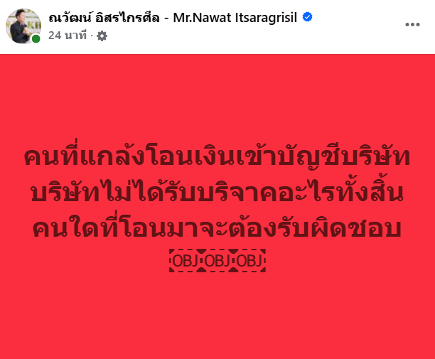 "คนที่แกล้งโอนเงินเข้าบัญชีบริษัท บริษัทไม่ได้รับบริจาคอะไรทั้งสิ้น คนใดที่โอนมาจะต้องรับผิดชอบ" และ "การกระทำตั้งใจกลั่นแกล้งผู้อื่น และนำไปโพสต์มีความผิดทางอาญา"